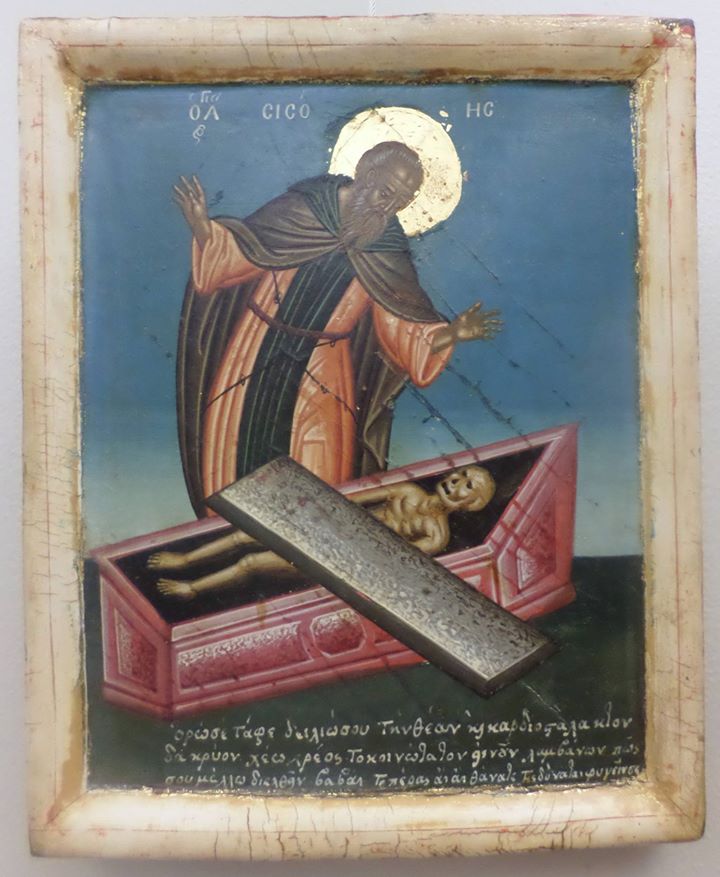 The icon called “The Astonishment of Sisoes” first appears in the fifteenth century. It shows him looking into the broken tomb and seeing the bones lying there. This text is lettered onto the icon:“Sisoes, the great among ascetics, stood before the tomb of Alexander, Emperor of Greeks, who at one time had shone with glory. Astonished, he weeps for the inexorable passing of time and the transience of glory. He cries out with tears, ‘Beholding you, O Tomb, I shed tears from my heart, and weep for the common debt of all mankind! How shall I bear this? O Death, who can escape you?’”