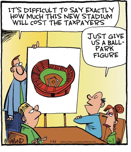 1. Subsidies for pro sports, including stadium construction, are damnable boondoggles. I would vote against every one of them until the franchise-owning billionaires ran me out of office.